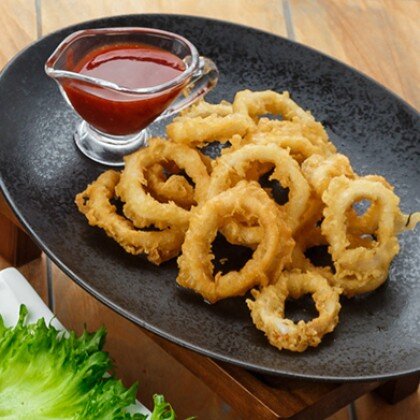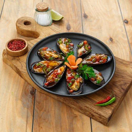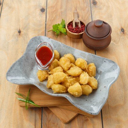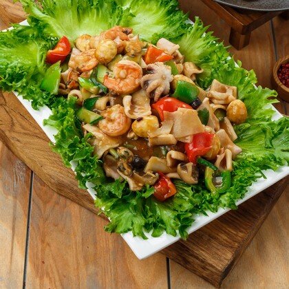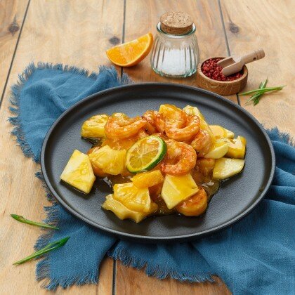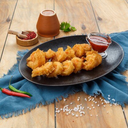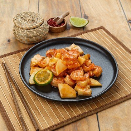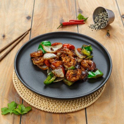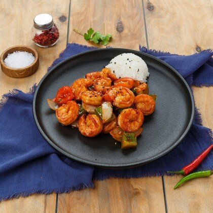 Тигровые креветки в панировке, обжаренные в японском соусе терияки, с добавлением сладкого перца, лука, цуккини, и кунжута. Подаются с маленькой порцией белого риса