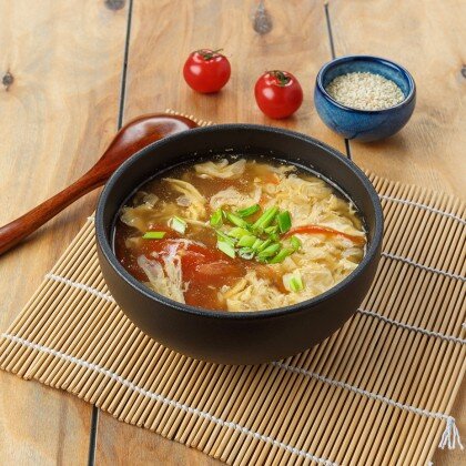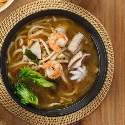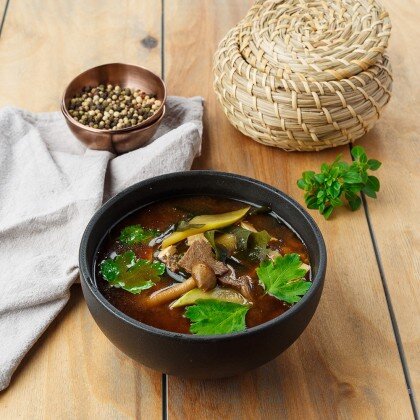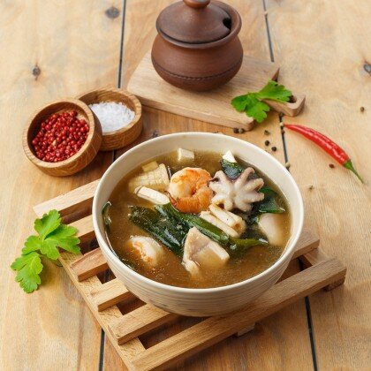 Традиционный тайский острый суп, сваренный на основе кокосового молока и рыбного соуса нам пла, с добавлением тигровых креветок, мидии в ракушке, кальмаров, помидор, тайских грибов, листьев Каффир-лайма, и галангала