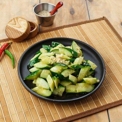 Острый салат из битых огурцов, с добавлением острого красного перца, заправленный кунжутным маслом и соевым соусом